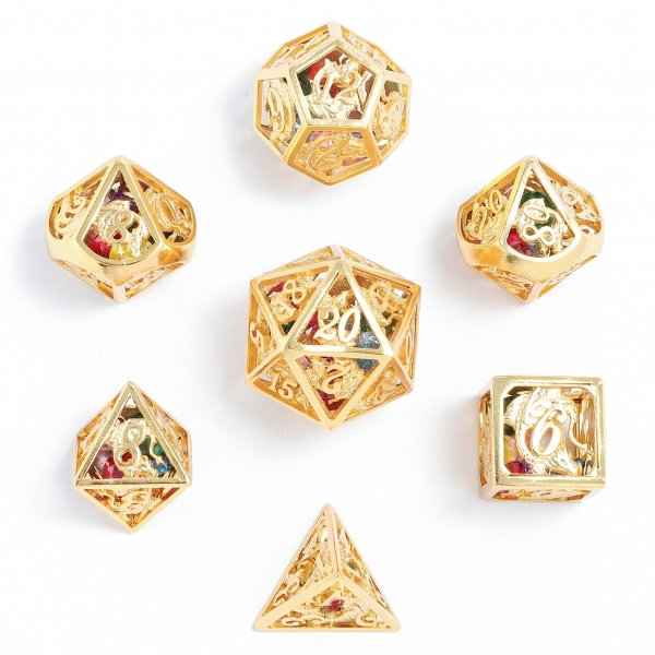 Hollow Metal Dragon Dice Set filled with gems - 24k gold plated