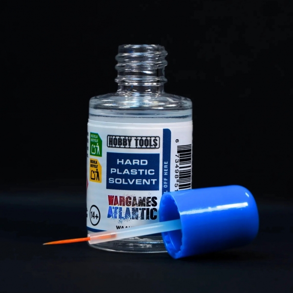 Our Hard Plastic Solvent is designed specifically for our plastic (High Impact Polystyrene or HIPS). Whereas superglue just "sticks" two parts together and is prone to come apart under duress, solvent literally fuses the two pieces together. The applicator brush is also great to smooth over the join lines between parts (for example where the arm meets the shoulder). For best results, start with our Hard Plastic Clippers and Hard Plastic Nano Files to expertly prep your models for painting.