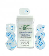 Polyhedral Dice Set: Translucent White/Blue dice w/ Arch'd4 & Balance'd20 (7)