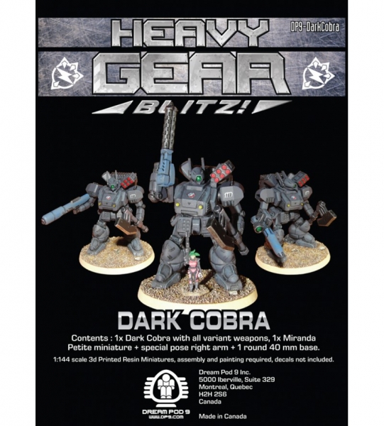 1x Dark Cobra Gear for the Black Talon Faction. Includes all the variant weapons, plus extra special pose right arm, 1x Miranda Petite miniature, and 40mm round base.