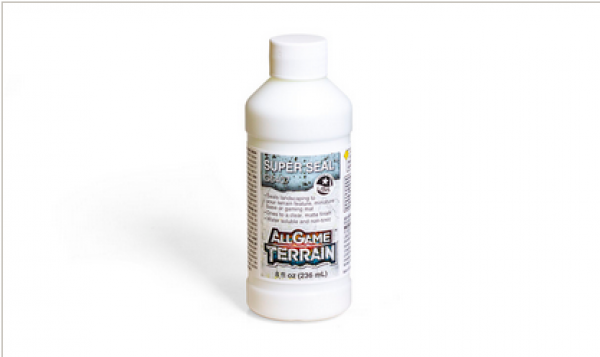 This spray adhesive seals landscape materials onto your terrain feature, miniature base or gaming mat. Super Sealâ„¢ goes on white and dries to a clear matte finish. Ideal for use with Flowers, Weeds, Sand, Gravel and more. Apply with Sprayer for an even application. Super Seal is water soluble and non-toxic.