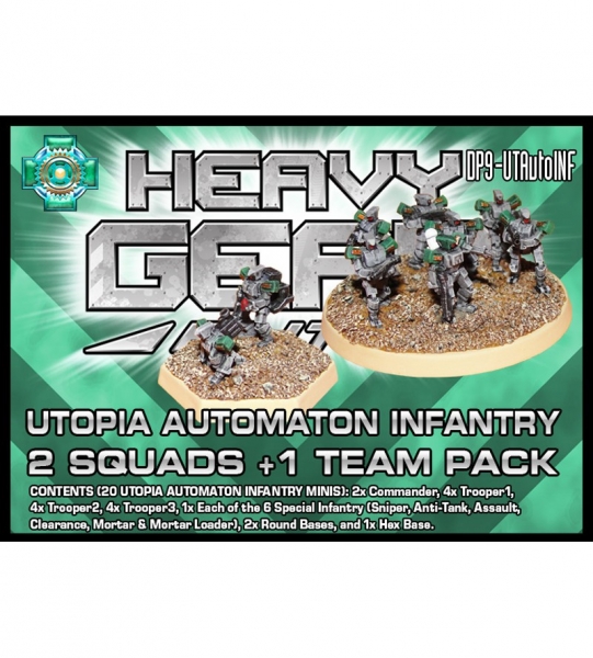 The Utopia Automaton Infantry 2 Squads +1 Team Pack has been designed around the new edition rules. A typical squad is represented by 5 to 10 Infantry minis on a 40mm round bases and a Teams by 1 to 4 infantry minis on a hex base. The photos below include a parts photo and a photo of a typical Squad with 1 Commander and 6 Troopers, plus 6 Special Infantry (Recon, Sniper, Anti-Tank, Assault, Mortar, and Clearance). 3d Printed miniatures using ABS like resin and black plastic bases all packaged in a small plastic clamshell blister. Includes: 2x Commander 4x Trooper1 4x Trooper2 4x Trooper3 1x Each of the 6 Special Infantry miniatures (Recon, Sniper, Anti-Tank, Assault, Mortar, and Clearance) 2x round 40mm base 1x hex base
