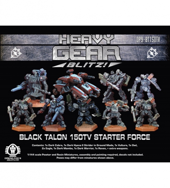 The bundle includes 9 Black Talon pewter miniatures that can make 2 combat groups (SK & FS) with 142 to 150 TV total before any faction or general upgrades are taken.