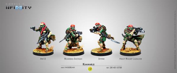 This box includes four miniatures: One Khawarij with Boarding Shotgun, one Khawarij with Heavy Rocket Launcher, one Khawarij with Mk12 and Multispectral Visor L2 and one Khawarij with Spitfire. With this box we can strengthen our Haqqislam Army (REF: 280489-0597) and prepare for the near future of the super-soldiers.
