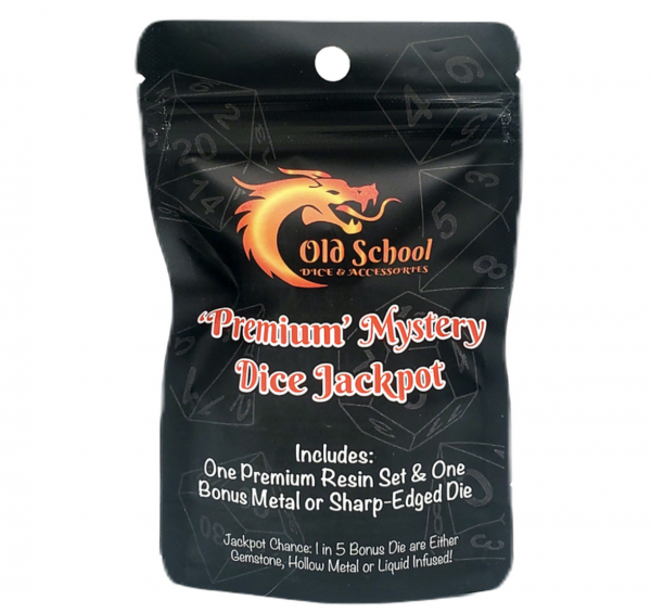 Welcome to the 'Premium' Mystery Dice Jackpot bag! Wait, what does that mean? It means Great Value and chance for Ridiculously Great Value! Each "Premium" Mystery Dice Bag contains an awesome full 7-piece Resin set. In addition, we throw in a 'Bonus' metal or sharp-edged die! The best part is that 1 in 5 Mystery Dice Jackpot bags has a special 'Premium" die. This "Premium" die will be either a Liquid Infused die, a Hollow Metal die, or a Gemstone die! Total Value of each bag can range from $24-$43!