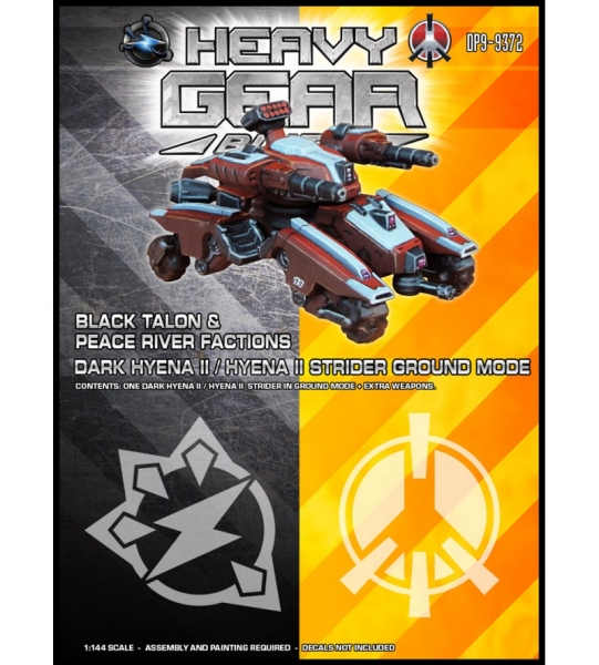 1 Hyena II / Dark Hyena II Strider in Ground Mode resin miniature with extra weapon parts. Fielded by the Peace River and Black Talon factions. 1/144 scale. Assembly and painting required, decals not included.
