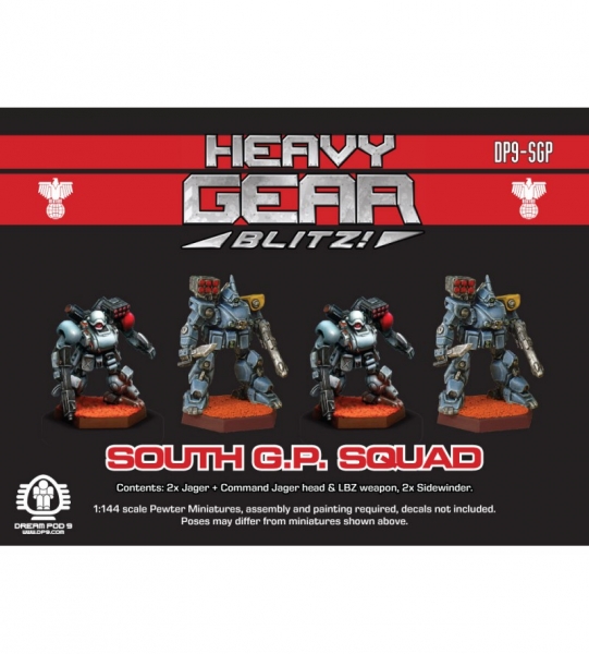 The Southern G.P. (General Purpose) Squad includes 4 pewter miniatures (2x Jager with standard weapons (LAC, LRP and LVB) + Command Jager head & LBZ weapon, 2x Sidewinder with standard weapons (MAC and MRP), and 4x hex bases). All packaged in a small black box with squad photo on top (packaging upgraded to small black box in Summer 2023). Painting and assembly required, decals not included. (Poses may vary from parts shown.)
