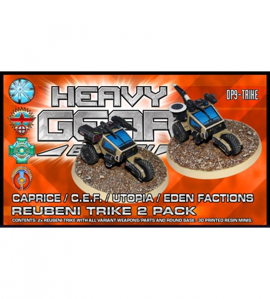 The Reubeni Trike was designed on Caprice and used by Caprician, C.E.F., Eden, and Utopia Forces. With 3 variants, the stock Reubeni Trike for off-road scouting and electronic warfare, the tactical variant with Light Rifle (LRF),and the attack variant with Light Autoncannon (LAC) and Light Rocket Pack (LRP). Includes 2x Reubeni Trike 3D printed resin miniature with all variant weapons/parts and 40mm round base, packed in our standard clamshell blister. 33mm long by 21mm wide by 17mm tall at 1/144 scale. Painting and assembly required, decals not included.