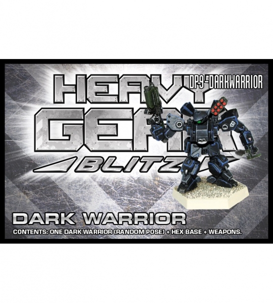 The parts to build one pewter Dark Warrior miniature (Warrior and Dark-series v-engine and weapons). Includes the following weapons: Light Autocannon/Frag Cannon Rapid Fire Bazooka Medium Autocannon/Light Grenada Launcher Snub Cannon Light Vibroblade Light Rocket Pack Light Grenade Launcher Command Upgrade Head