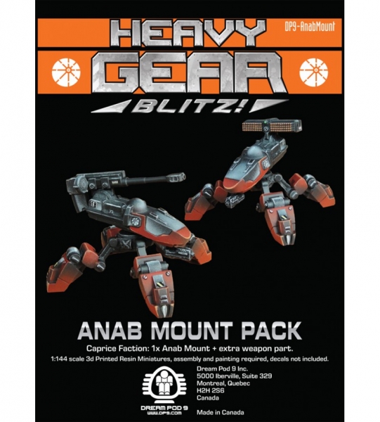 The new Anab Mount for the Caprice Faction includes 1x Anab with posable legs, plus Light Sub-Machine Gun (LSMG), Light Field Gun (LFG), and Medium Artillery Rockets (MAR link) weapon parts. The Anab was 3d modelled by Tony Baltera for Dream Pod 9. Parts come in a plastic clam shell blister with color product card in front of a ziplock bag will all the resin parts.