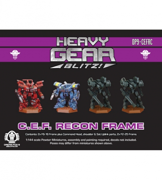 The CEF Recon Frame Squad includes 4 pewter miniatures (1x CF6-16 Frame (head and shoulder parts) with standard weapon (LLC) and Sat-Uplink part, 1x F6-16 Frame (Recon Pack) with standard weapons (LLC) plus Sensor Boom part, 1x BF2-25 Frame with standard weapon (LLC) plus Jumpjets standard, 1x BF2-25 Frame (AT Pack) with standard weapons (LLC and LATM) plus Jumpjets standard, plus the following extra weapons (2xLLG + Shield (Assault Pack), 1x Jumpjets (Assault Pack), 1x LGM (Support Pack), 2x Sensor Boom (Recon Pack)), and 4x hex bases). All packaged in a small black box with squad photo on top (packaging upgraded to small black box in Summer 2023). Painting and assembly required, decals not included. (Poses may vary from parts shown.)