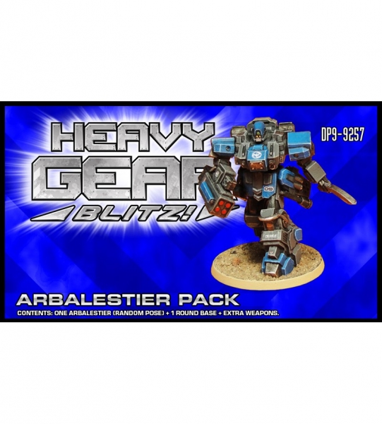 The Arbalestier is an Gear for the NuCoal Forces. The model is made of Pewter and includes extra weapons to make 1 stock or variant model. The model includes a random leg pose of either walking or standing legs. Assembly and painting required, decals not included.