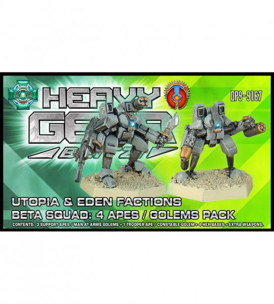 Beta Squad Pack - for the Utopia and Eden factions includes 3 Support APEs / Man at Arms Golems, 1 Trooper APE / Constable Golem with 4 hex bases and extra weapons. The Support APE/Man at Arms Golem is 27mm tall and Trooper APE/Constable Golem is 25mm tall when mounted on hex bases and are 1/144 scale.