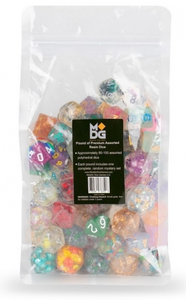 Each pound contains approximately 80-100 premium resin dice, as well as one mystery set. Enjoy a random mix of shapes and colors, including MDG favorites as well as exclusive colors and effects that have never been released.