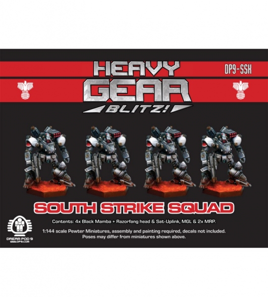 The Southern Strike Squad includes 4 pewter miniatures (4x Black Mamba with standard weapons (MAC, LRP and LVB) + Razorfang Black Mamba head & Sat-Uplink part, plus the following extra weapons (MGL and 2xMRP), and 4x hex bases). All packaged in a small black box with squad photo on top (packaging upgraded to small black box in Summer 2023). Painting and assembly required, decals not included. (Poses may vary from parts shown.)
