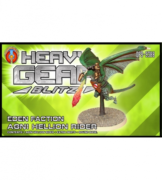 The Eden - Agni Hellion Rider Pack is a resin miniature that includes 1 Agni Hellion with 3 different infantry tops, optional fire breath part, flight post, and 40mm round base. Assembly and painting required, decals not included. The Angi Hellion are about 55 mm tall when mounted on flight post and base.